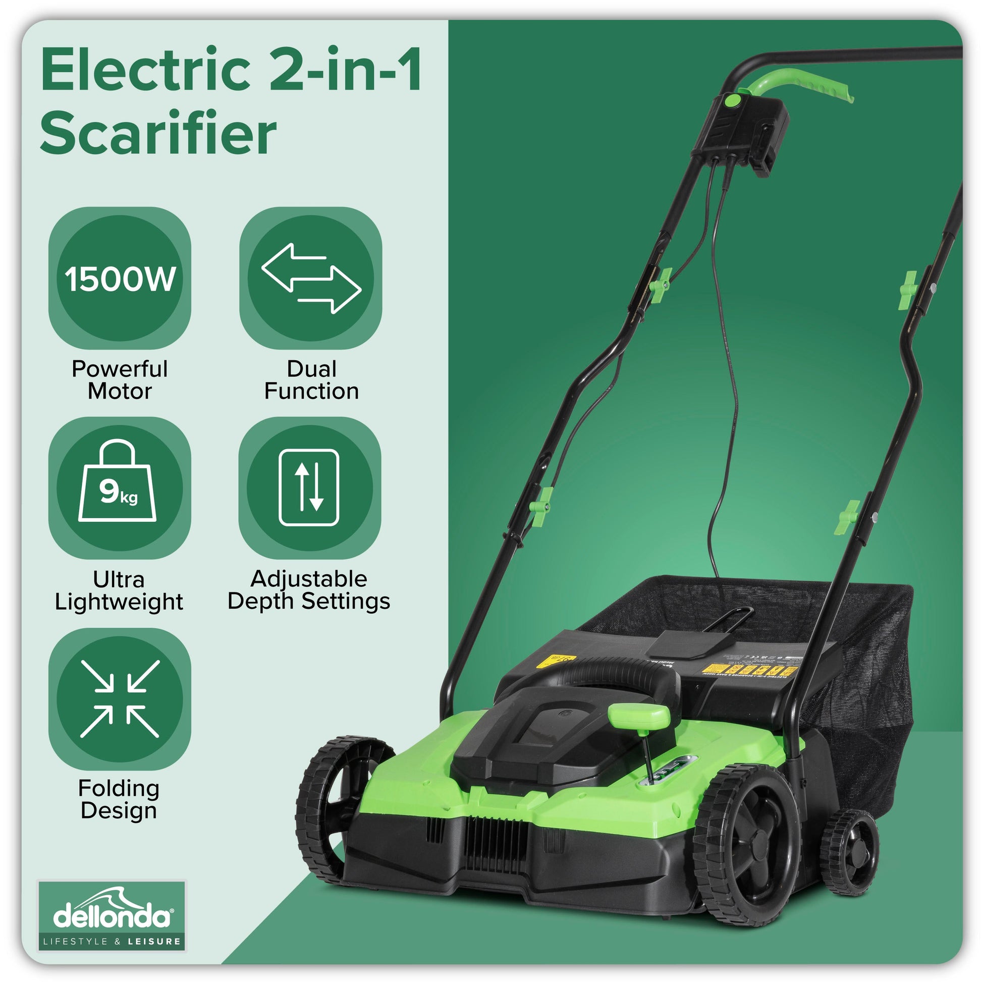 - Rejuvenate and control the finish of your lawn/garden with this 2-in-1 Electric Scarifier and Rake with a powerful 1500W motor and spacious 35L grass collection bag.