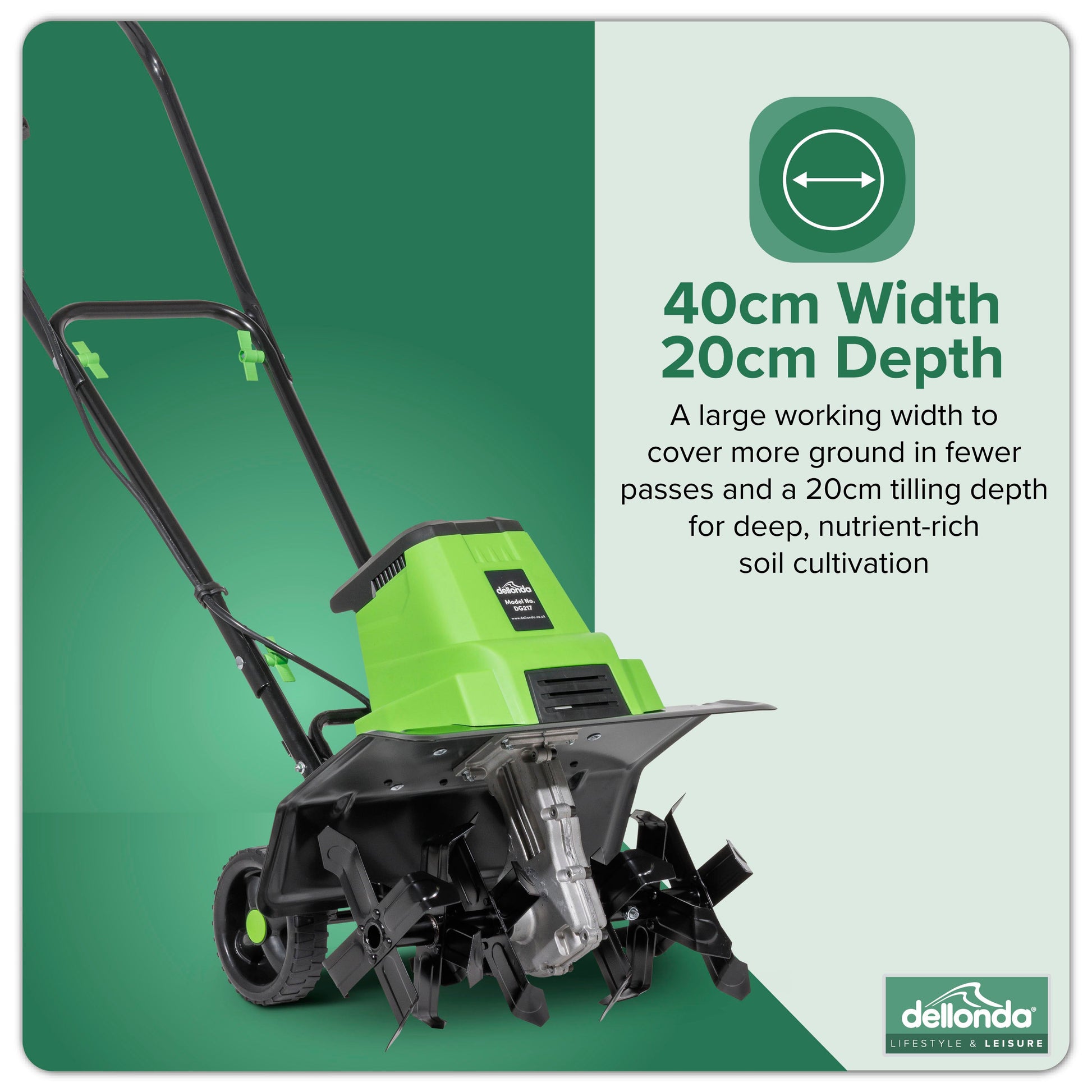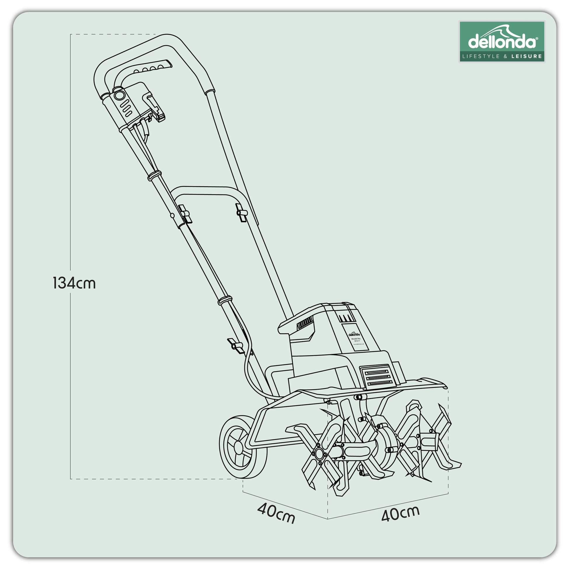 - Weighing in at just 12kg makes the Dellonda electric tiller/cultivator easy and comfortable to use and manoeuvre around your garden. The foldable frame increases portability and ease of storage.