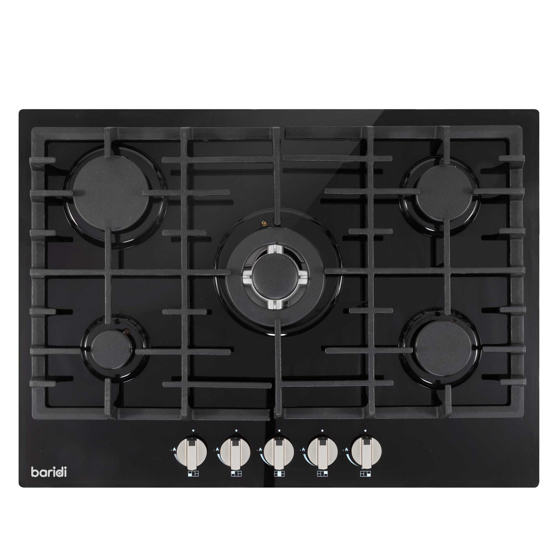 Baridi 70cm Gas on Glass Hob Built-In, 5 Burner and Cast Iron Pan Supports, Black Glass - DH228