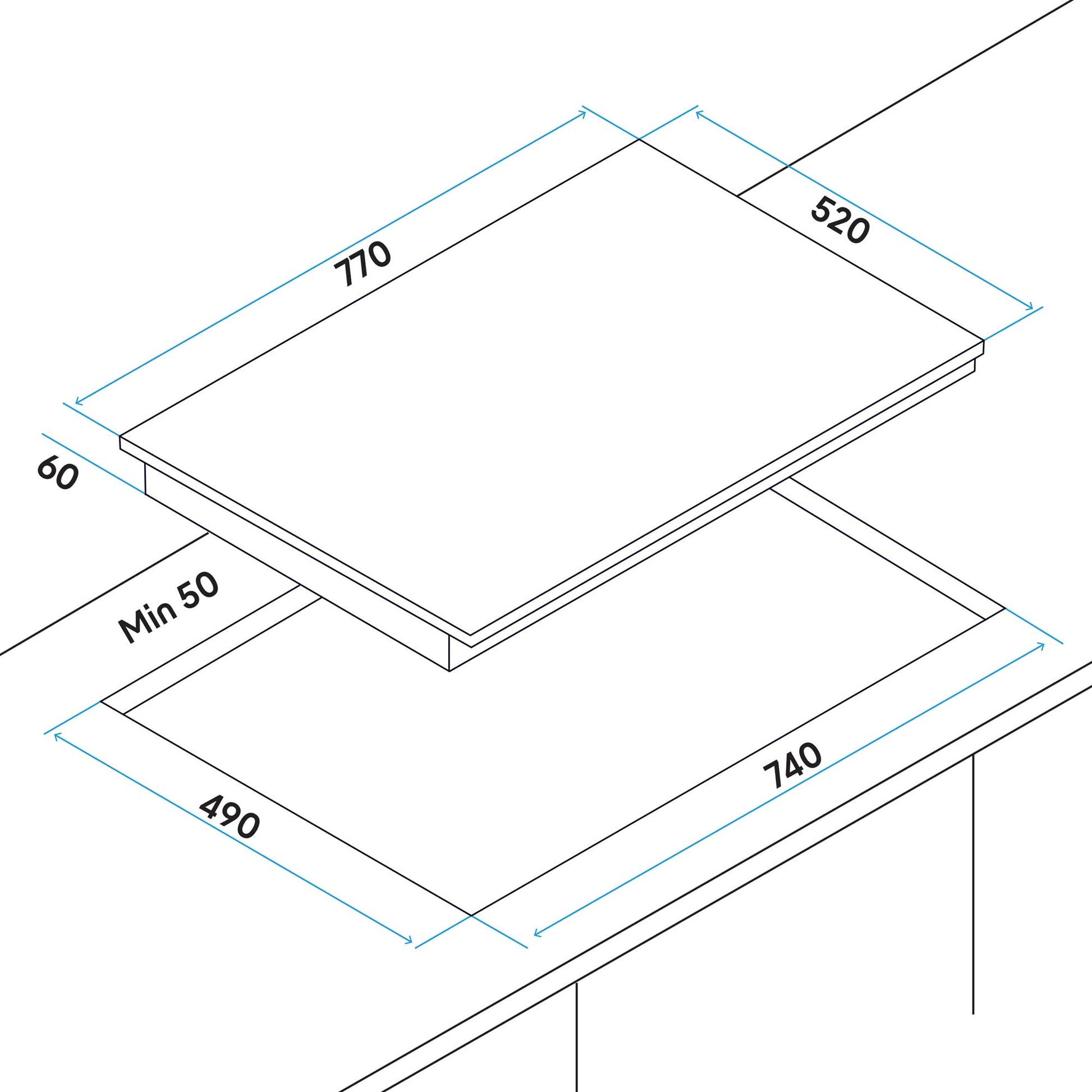 - Product Dimensions (W x D x H): 770 x 520 x 58mm, not supplied with a mains plug, this hob must be hard-wired. Cut-Out Required (W x D): 740 x 490mm Please note this product can only be used with induction pots and pans.