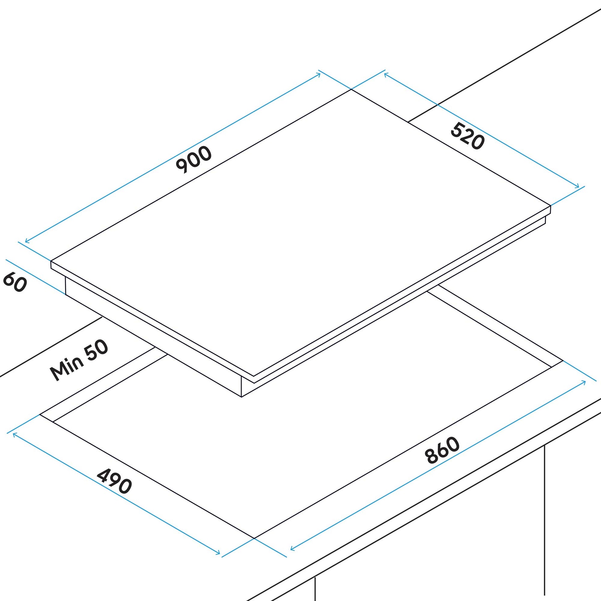 - Product Dimensions (W x D x H): 900 x 520 x 58mm, not supplied with a mains plug, this hob must be hard-wired. Cut-Out Required (W x D): 860 x 490mm Please note this product can only be used with induction pots and pans.