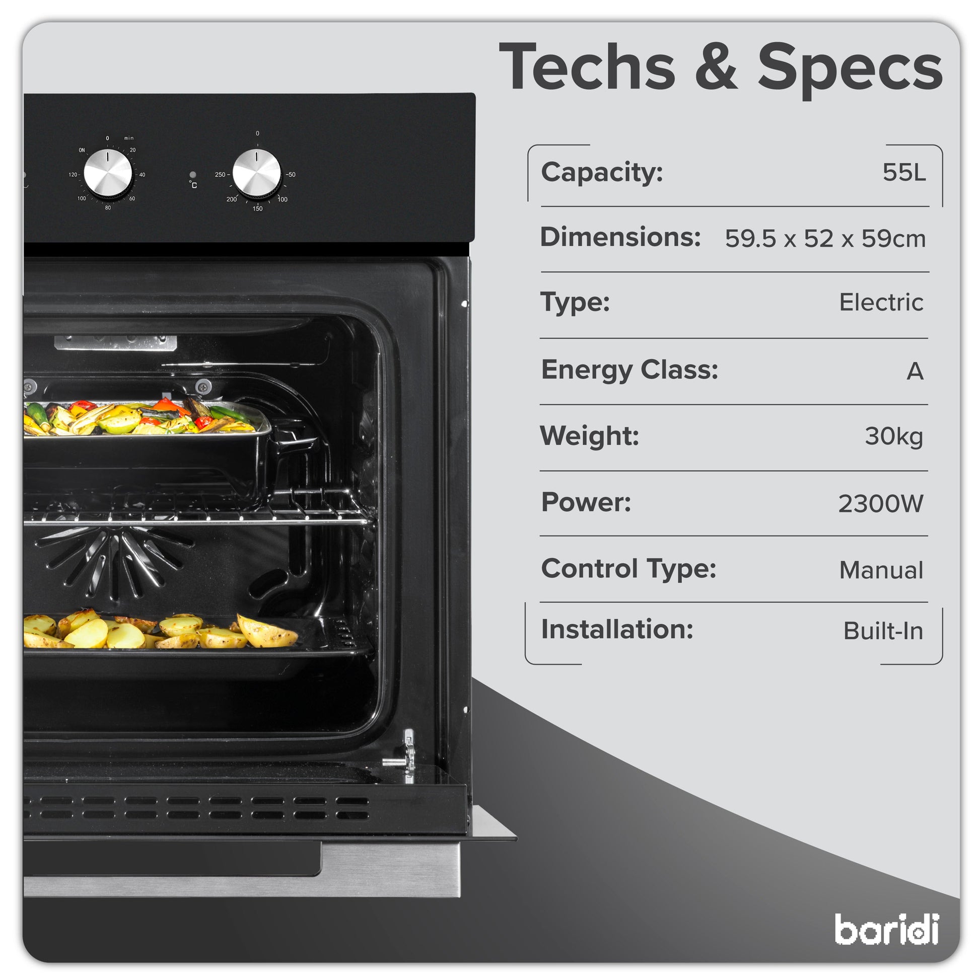 - SPECIFICATION- The four shelf positions offer versatility with the supplied baking tray and grill shelf so that you can start cooking right away. Designed to complement Baridi Cooker hoods and hobs as well as our range of wine coolers and drinks fridges. Oven Size 595 x 520 x 590mm, Internal dimensions 425 x 370 x 340mm.