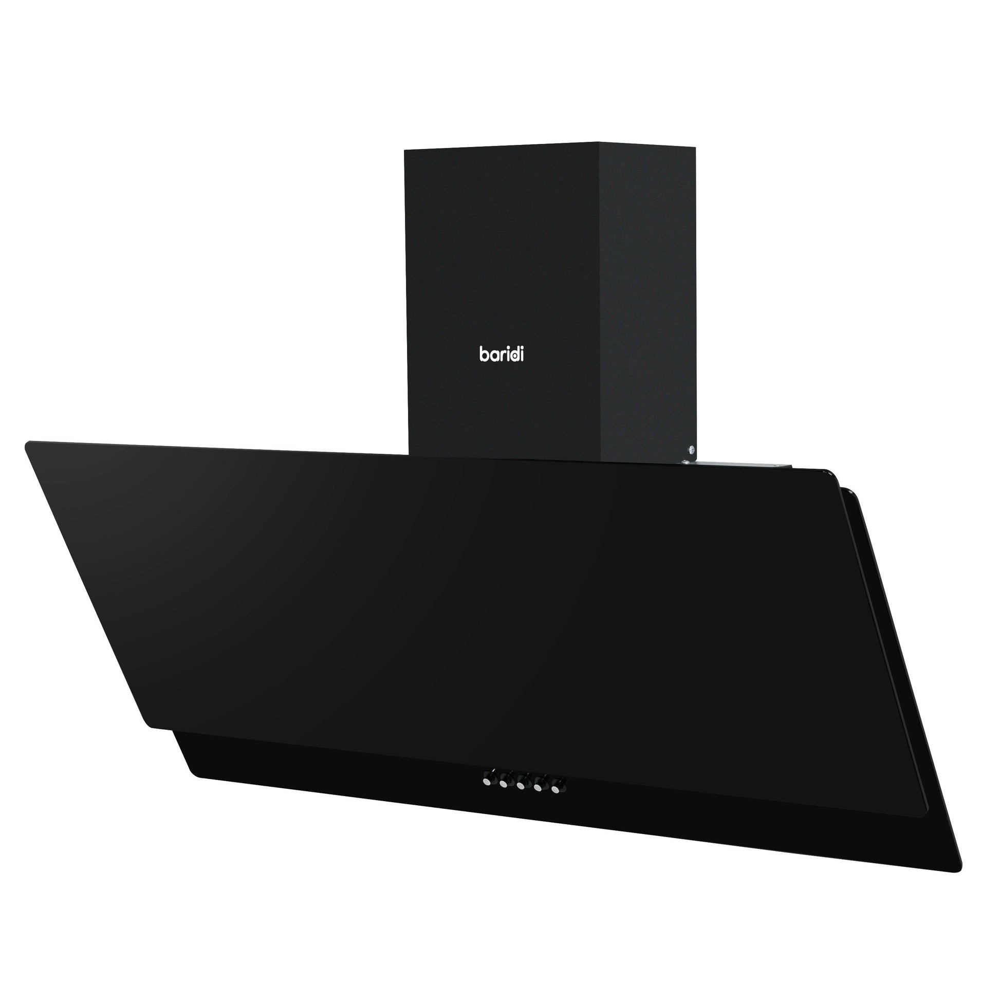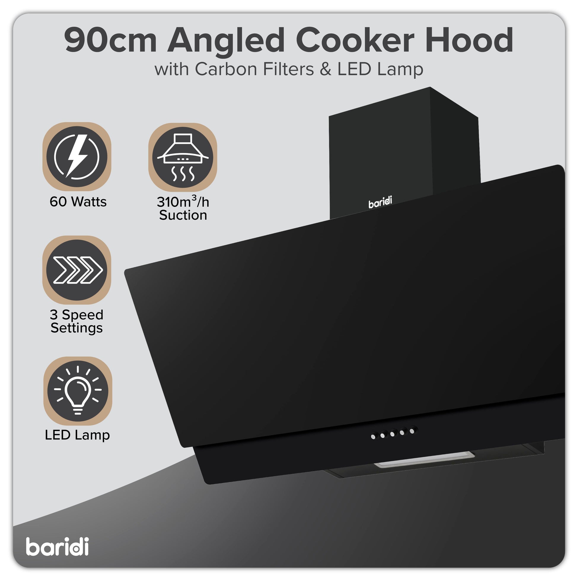 Baridi 90cm Angled Chimney Cooker Hood with Carbon Filters, LED Lamp, Black Glass - DH106