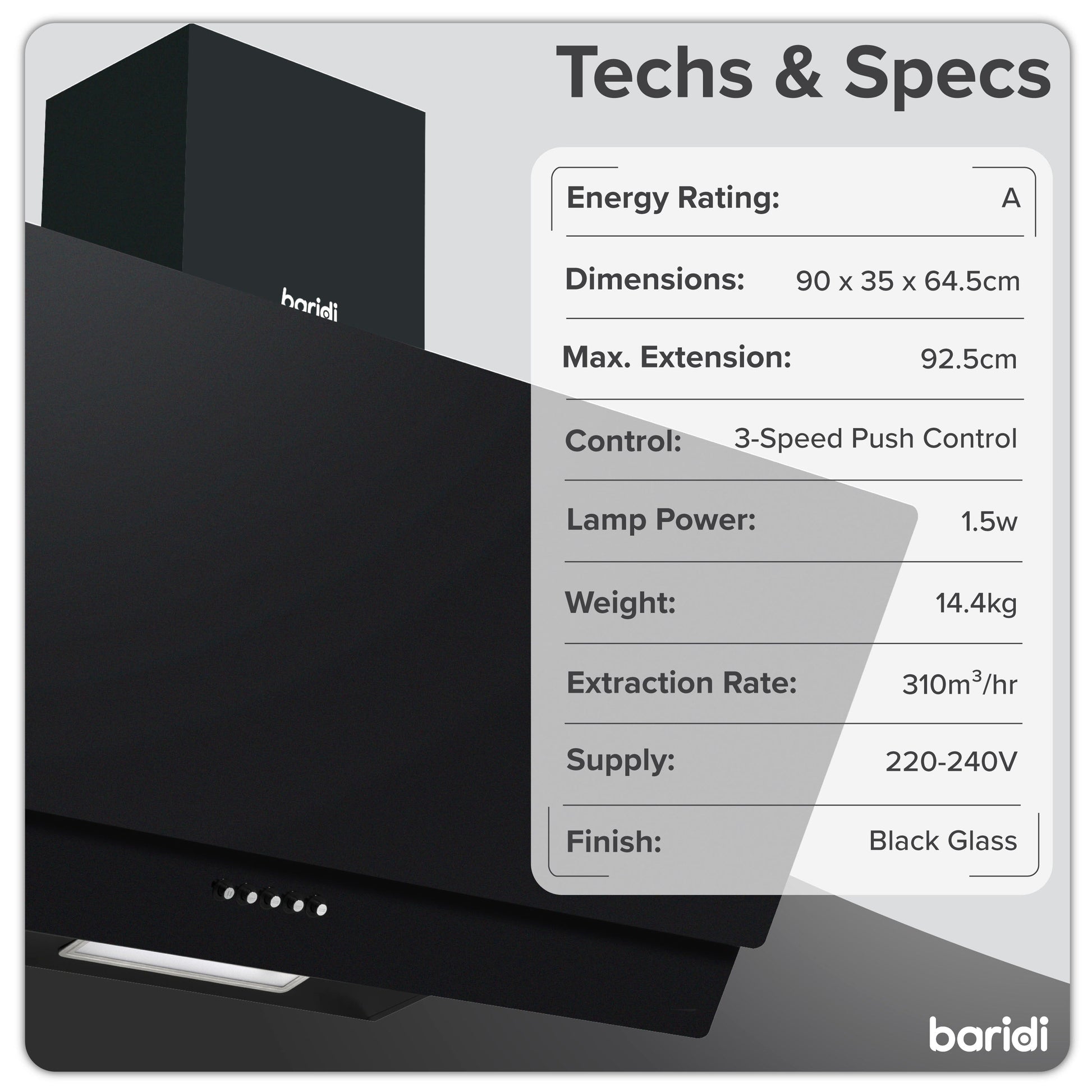 - Energy Efficiency - Save money with a class A extractor hood compared to the class B & C hoods. Higher efficiency means less noise and a more powerful fan without the need for higher electricity bills.