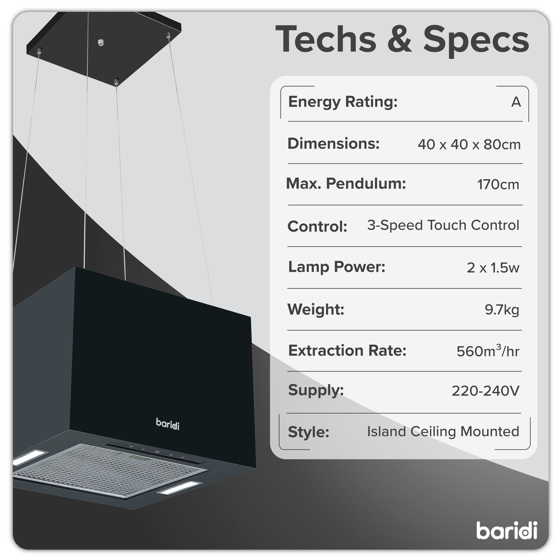 Baridi Island Cooker Hood, Square, 40cm, 3-Speed, Black - DH109