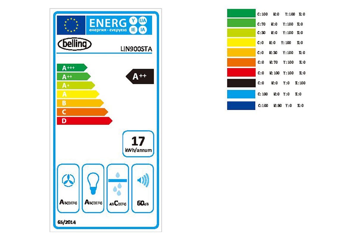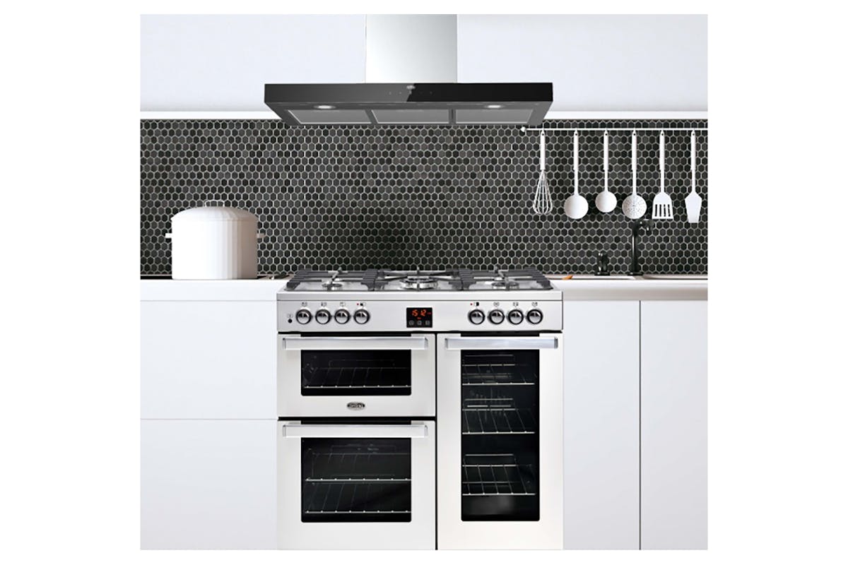 Belling 90cm Linear Box Style Cooker Hood 90cm Belling Linear 'box' style chimney Hood 'A++' energy rating Extra quiet 59dba BLDC brushless motor Touch control panel with hands free 'gesture control' 4 speeds Boost function with extra Powerful 650 m3h extraction 2 LED lights 5 layer washable aluminium grease filter 500mm+490mm chimney 1.5 metre flexible ducting supplied stainless/black mix