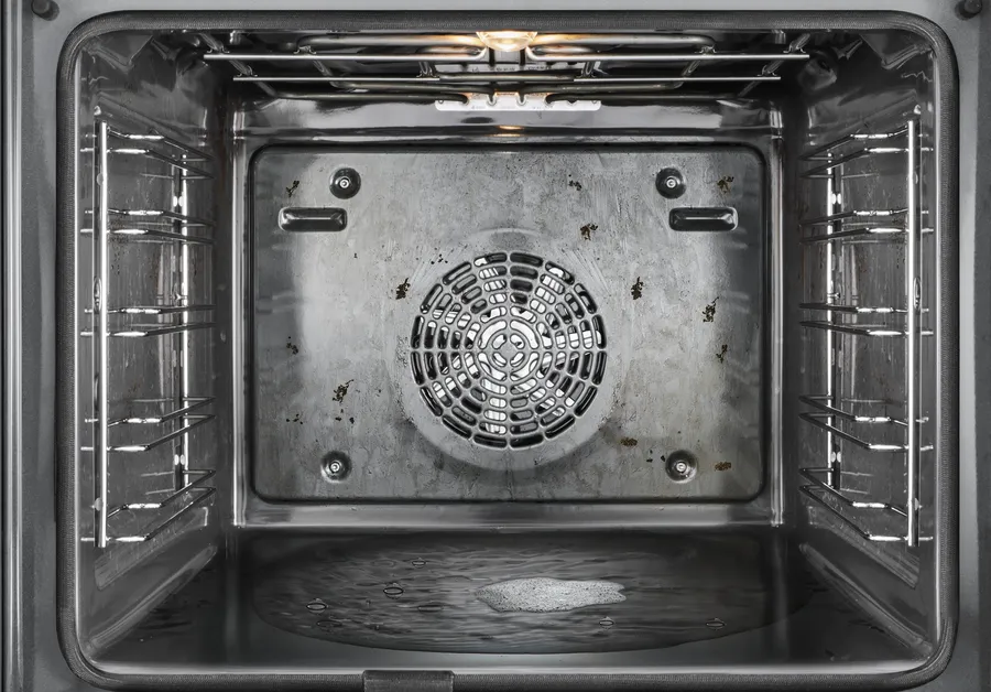Your oven is just a little dirty and you want to clean it quickly? Just place approximately 400ml of water and a drop of washing-up liquid in the base pan and then set the appropriate heating mode (bottom heat), temperature (80°C) and duration (4 minutes). The environmentally friendly cleaning system softens baked-on residues so you can just wipe it down, for fast and uncomplicated oven cleaning.