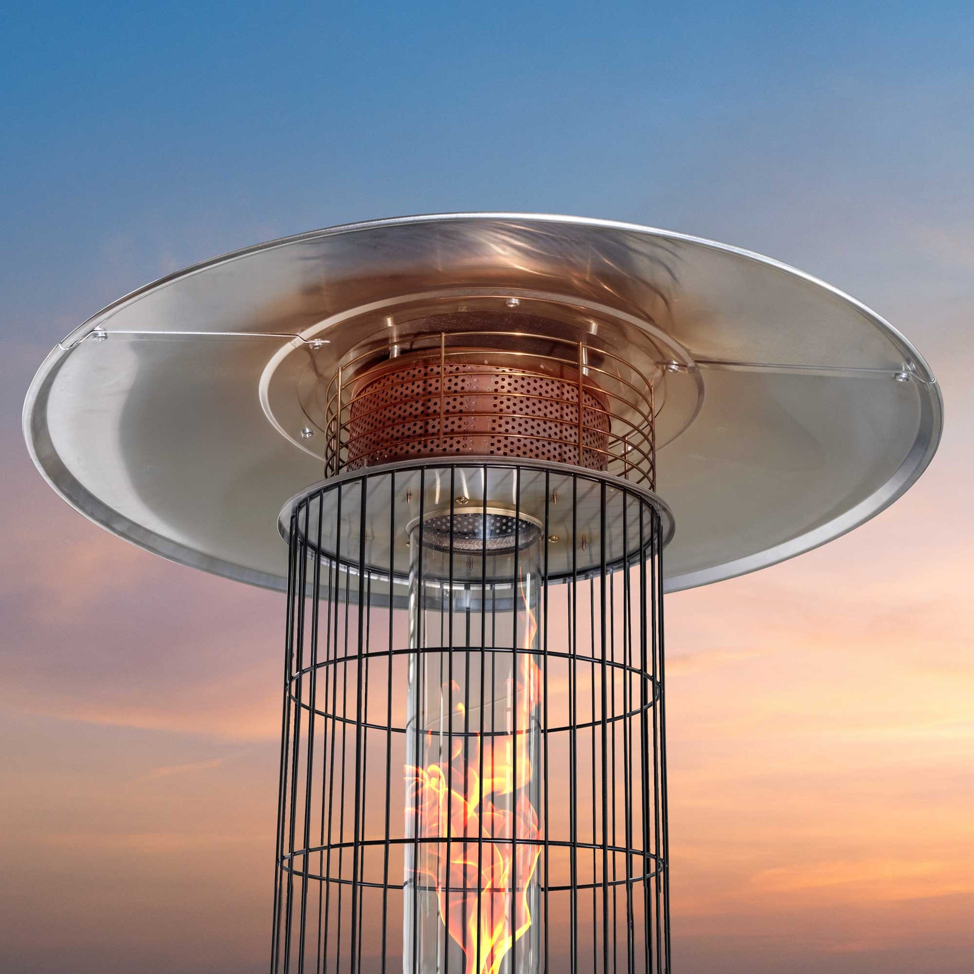 - Standing at 2.1m tall, when lit this innovative gas patio heater produces a real flame encompassed by a glass tube and heats the surrounding area.