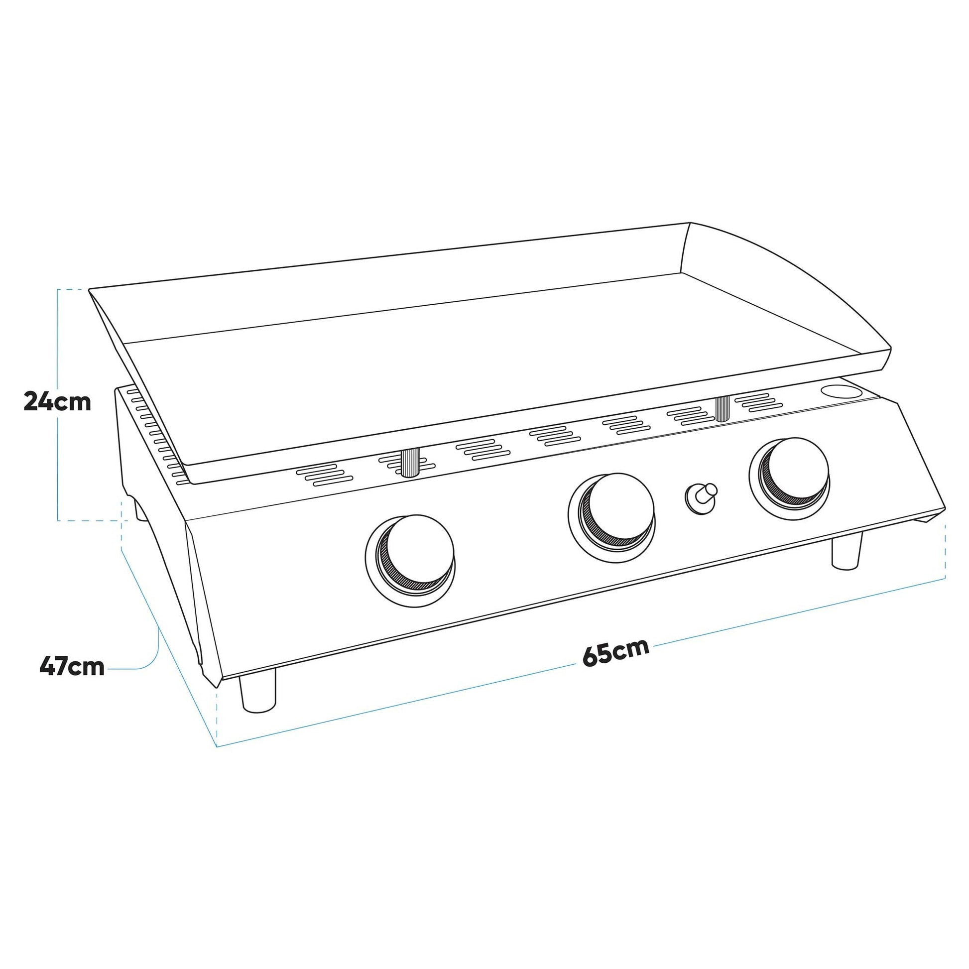 - Compact Size - (W x D x H): 650 x 470 x 240mm (Includes gas connection hose). Supplied with regulator and hose assembly for use with propane patio gas bottles. 3.5mm high quality steel cooking plate with an enamel coating. Cooking Area (W x D): 620 x 360mm. Power: 7.5kW (2.5kW per burner).
