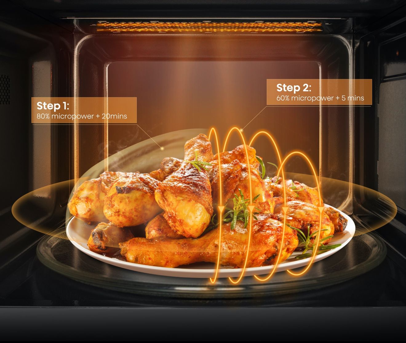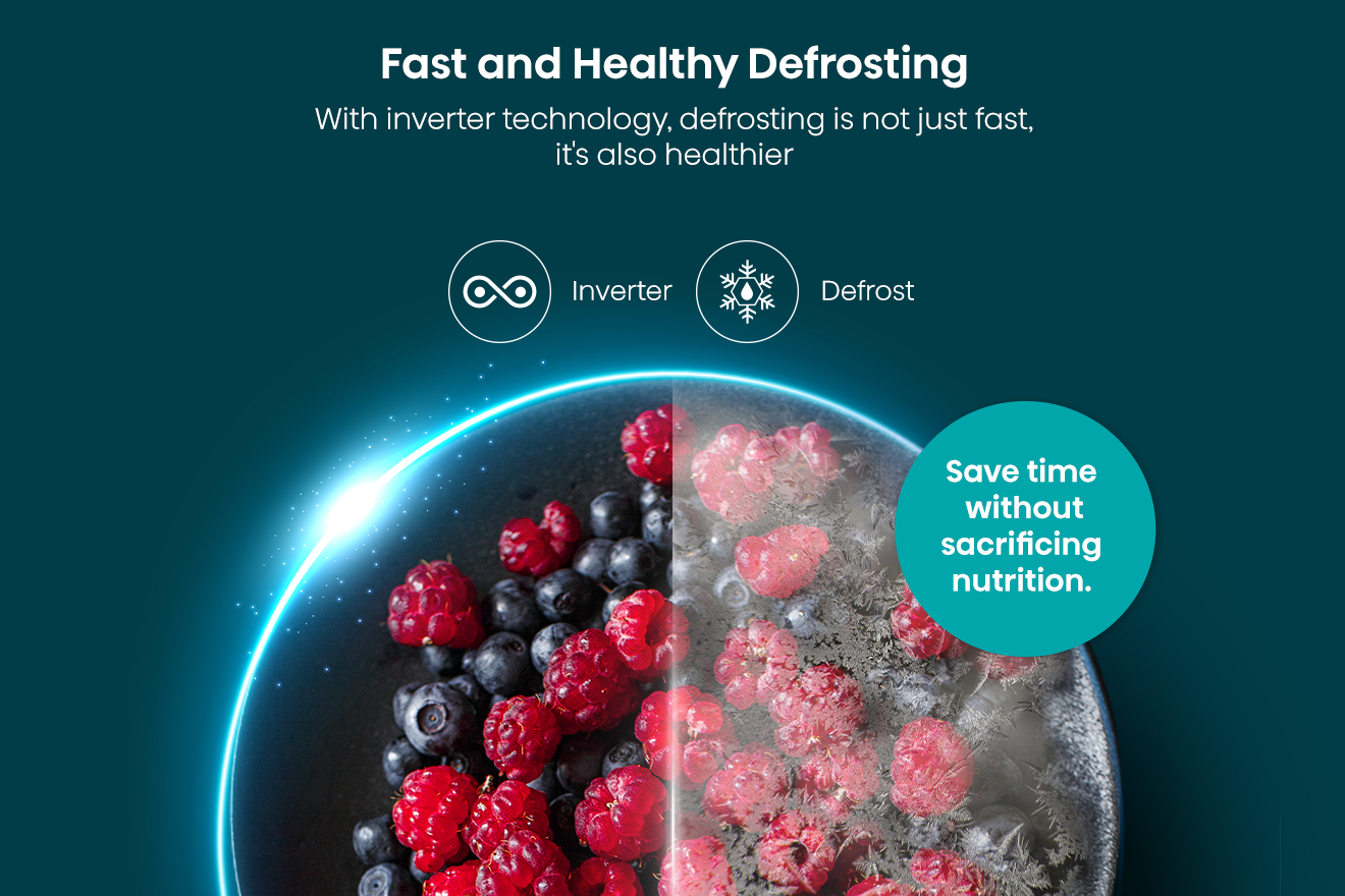 The defrost function thaws food quickly and evenly with low-heat internals, preventing partial cooking while preserving texture and flavour.