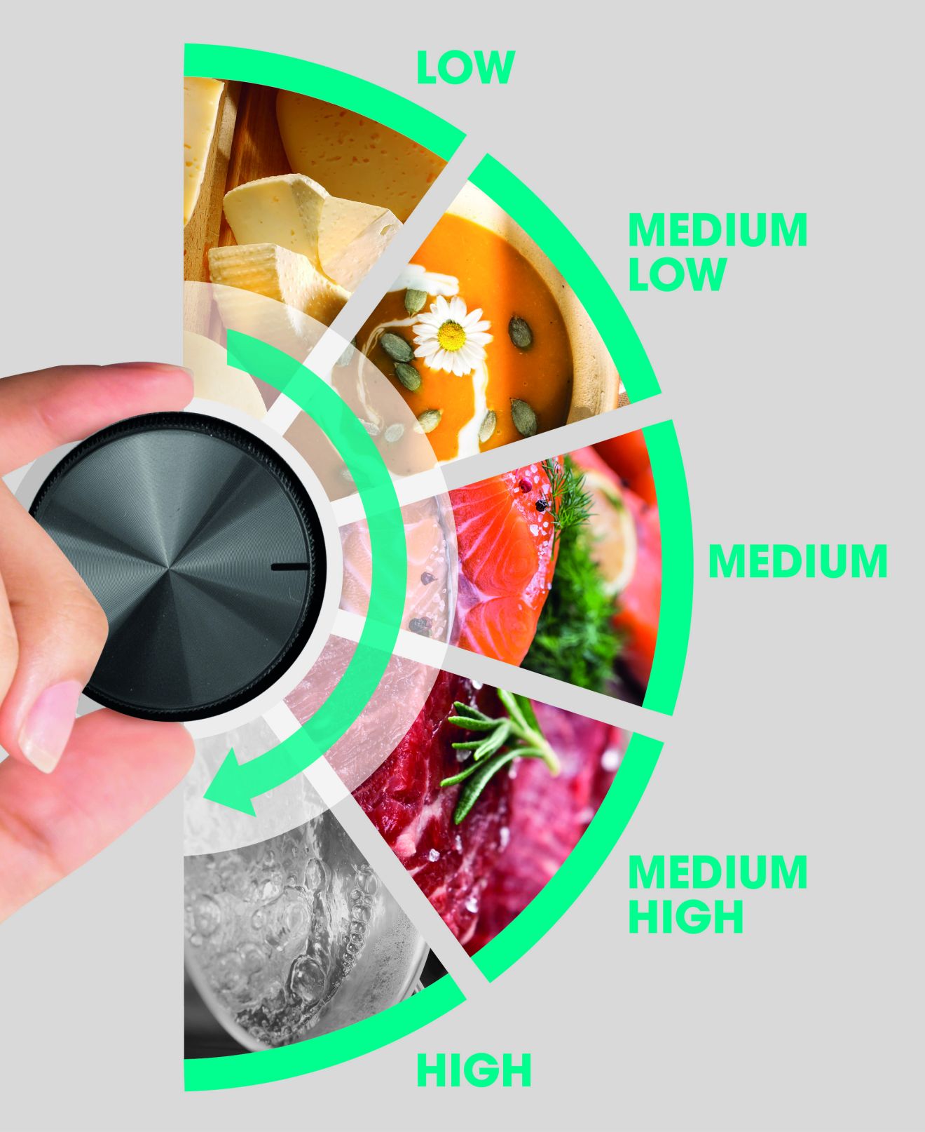 Tailor your cooking experience by choosing the right power level. High power is great if you want to heat something as quickly as possible. Boiling water or cooking non-creamy soups are good examples of when the highest power setting is appropriate. Medium-high settings allow you to steam or fry foods, while low settings are gentler, suitable for cooking creamy soupsand can also act as a dehydrator.