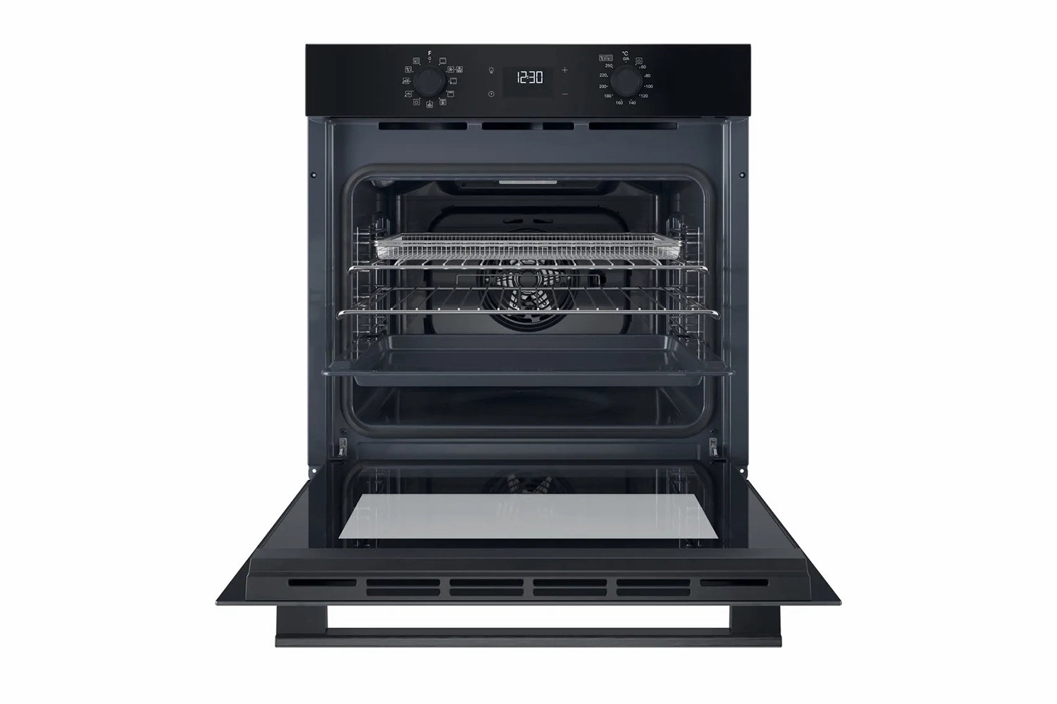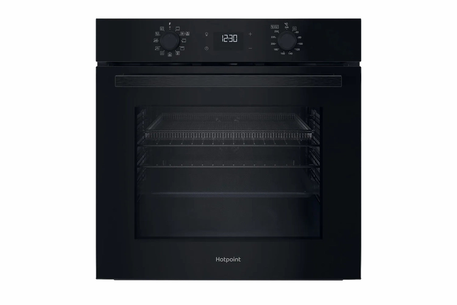 Transform your kitchen with this Hotpoint Class 2 oven, blending advanced technology and refined design for an enhanced cooking experience. Featuring a sleek black finish and flush dials for smooth interaction, this oven offers 8 cooking functions to help you achieve flawless meals every time. Thanks to Multiflow technology, heat is evenly distributed throughout the spacious 71L cavity, allowing you to cook a complete family meal on 3 levels simultaneously without flavour transfer, saving you both energy and time*. Craving crispy favourites? The dedicated Air Fry function lets you enjoy a healthier crunch with up to 50% less fat**, while the dishwasher-safe tray makes cleanup a breeze. Enjoy effortless cooking with 28 automatic recipes for your favourite home-cooked meals. Simply follow the recipe instructions, and your oven takes care of the rest. There's also a handy programmable timer that lets you set the cooking duration or delay the start, ensuring your meals are ready when you are. When it comes to cleaning, let Hotpoint do the hard work for you. Catalytic Clean is a self-cleaning system that uses special oven panels to catch grease and fat splatters, burning them off while you cook so any residue can be wiped away. The oven door is also easy to remove with a simple click, while the Tilting Grill unhooks and drops down, offering hassle-free cleaning. Not only that, but this oven has an A energy rating, so you can enjoy all these advanced features without worrying about your electricity bill. *Based on internal testing comparing tart, lasagna, and chicken drumsticks with roasted potatoes cooked on three levels simultaneously vs in three separate runs.