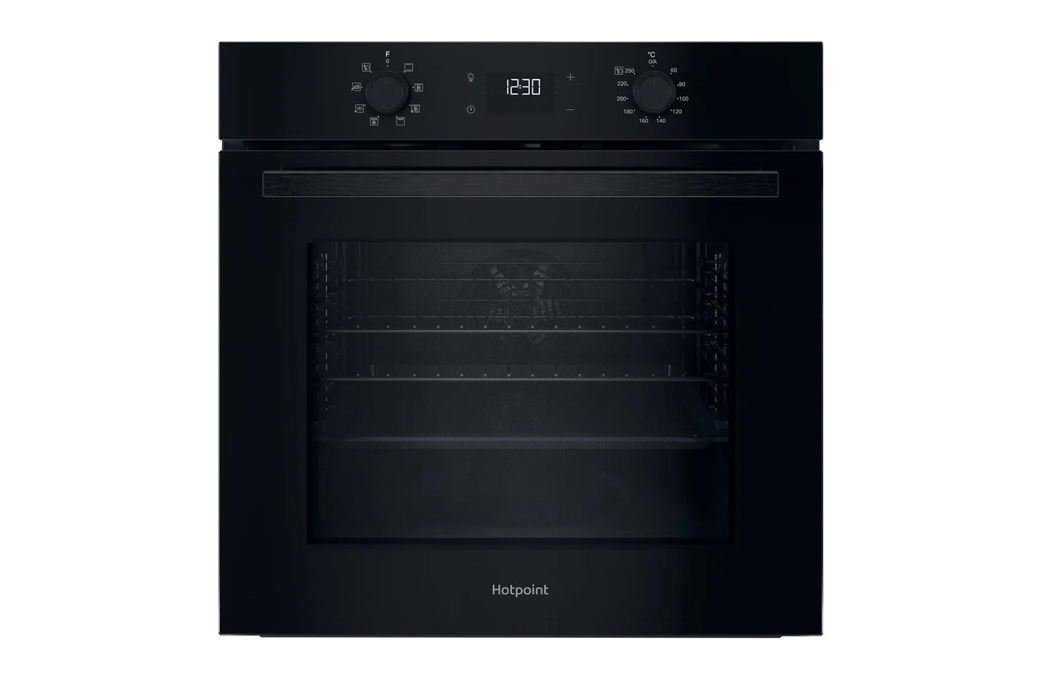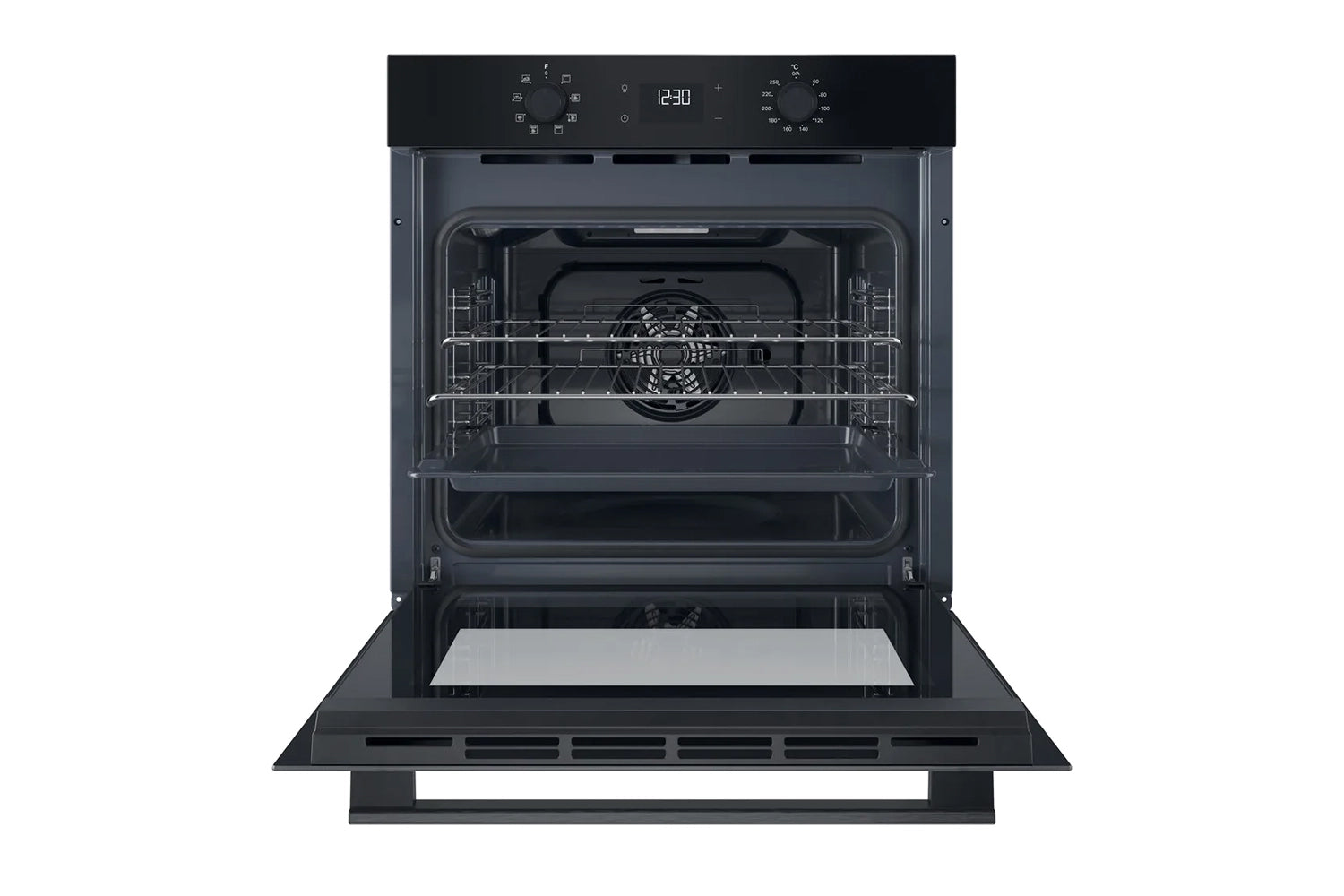 Transform your kitchen with this Hotpoint Class 2 oven, which blends advanced technology and refined design for an enhanced cooking experience. Featuring a sleek black finish and flush dials for smooth interaction, this oven offers 5 cooking functions to help you achieve flawless meals every time. Thanks to Multiflow technology, heat is evenly distributed throughout the spacious 71L cavity so you can cook a complete family meal on 3 levels simultaneously without any flavour transfer, saving you both energy and time*. For a crisp, golden finish, the Turbo Grill combines grilling with enhanced heat circulation, ensuring even cooking and flawless results. Enjoy effortless cooking with 28 automatic recipes for your favourite home-cooked meals. Simply follow the recipe instructions and your oven takes care of the rest. There's also a handy programmable timer that allows you to set the cooking duration or delay the start, ensuring your meals are ready when you are. When it comes to cleaning, let Hotpoint do the hard work for you. The quick and eco-friendly Diamond Clean cycle uses the power of steam to soften hardened residue so it can be wiped away. The oven door is also easy to remove with a simple click, while the Tilting Grill unhooks and drops down, offering hassle-free cleaning. Not only that, but this oven has an A energy rating, so you can enjoy all these advanced features without worrying about your electricity bill.