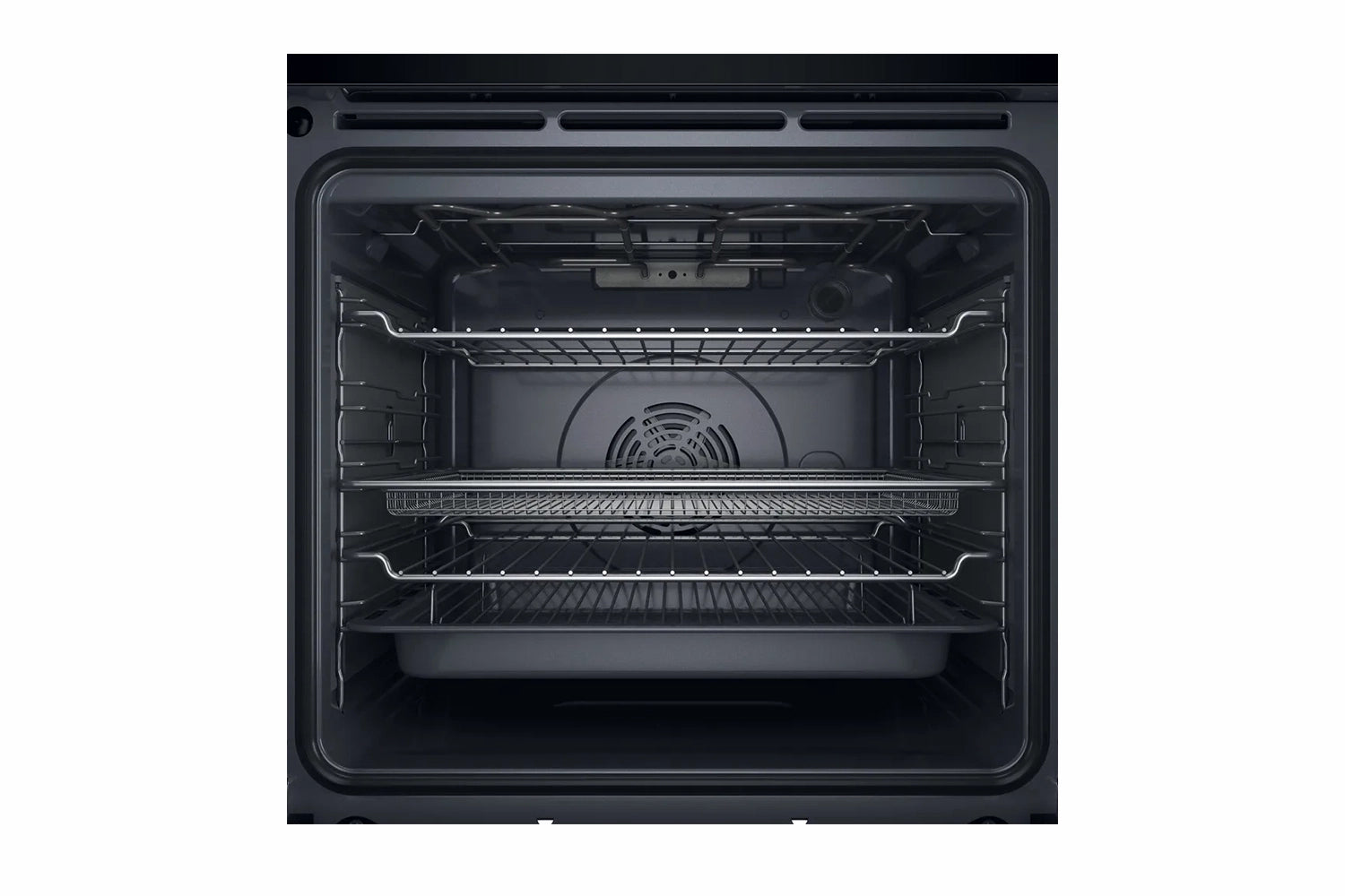 This Hotpoint Class 6 oven blends cutting-edge technology and sleek design to elevate your cooking experience. Featuring a stainless steel finish and intuitive touchscreen, it offers 8 cooking functions for perfect results every time. ActiveMultiFlow technology ensures even heat distribution across the 73L cavity, allowing you to cook on 4 levels simultaneously without flavour transfer. Save up to 50% in cooking time and 45% in energy*, ideal for entertaining family and guests. Enjoy healthier crispy favourites with the Air Fry function, reducing fat by up to 50%, and easy cleanup with the dishwasher-safe tray. The Pizza function reaches 310°C for restaurant-quality results in 10 minutes*. Gentle Steam locks in moisture and nutrients. Add water to the recess and choose from 3 steam settings for perfect bread, fish, and meats. MyMenu selects the optimal settings for 60 recipes, making meal prep effortless. The soft-closing door adds a touch of luxury. Cleaning is easy with Catalytic Clean, a self-cleaning system that burns off grease and fat while you cook, leaving residue easy to wipe away. With an A+ energy rating, enjoy all these advanced features without worrying about your electricity bill. *Comparing cooking roasted potatoes, lasagna, tart and chicken pieces on 4 levels simultaneously vs cooking the same dishes in 4 separate runs (internal report).