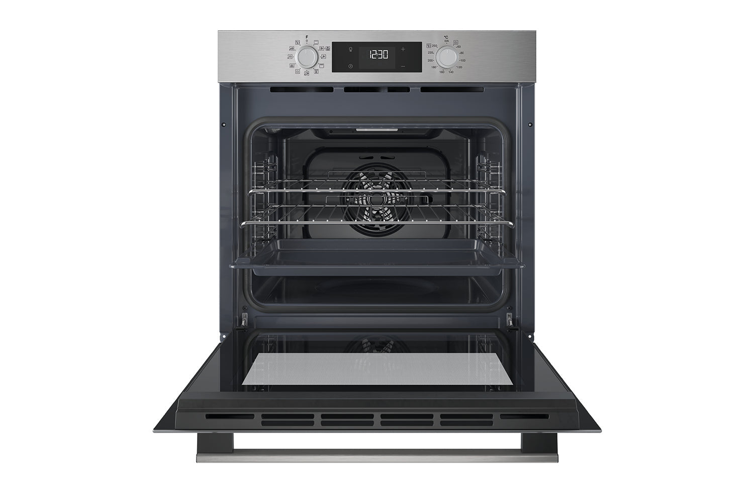 Transform your kitchen with this Hotpoint Class 2 oven, which blends advanced technology and refined design for an enhanced cooking experience. Featuring a sleek stainless steel finish and flush dials for smooth interaction, this oven offers 8 cooking functions to help you achieve flawless meals every time. Thanks to Multiflow technology, heat is evenly distributed throughout the spacious 71L cavity so you can cook a complete family meal on 3 levels simultaneously without any flavour transfer, saving you both energy and time*. For a crisp, golden finish, the Turbo Grill combines grilling with enhanced heat circulation, ensuring even cooking and flawless results. Enjoy effortless cooking with 28 automatic recipes for your favourite home-cooked meals. Simply follow the recipe instructions and your oven takes care of the rest. There's also a handy programmable timer that allows you to set the cooking duration or delay the start, ensuring your meals are ready when you are. When it comes to cleaning, let Hotpoint do the hard work for you. The quick and eco-friendly Diamond Clean cycle uses the power of steam to soften hardened residue so it can be wiped away. The oven door is also easy to remove with a simple click, while the Tilting Grill unhooks and drops down, offering hassle-free cleaning. Installation is easy with the UK fitted plug - simply remove the old appliance and plug in your new one. Not only that, but this oven has an A+ energy rating, so you can enjoy all these advanced features without worrying about your electricity bill.