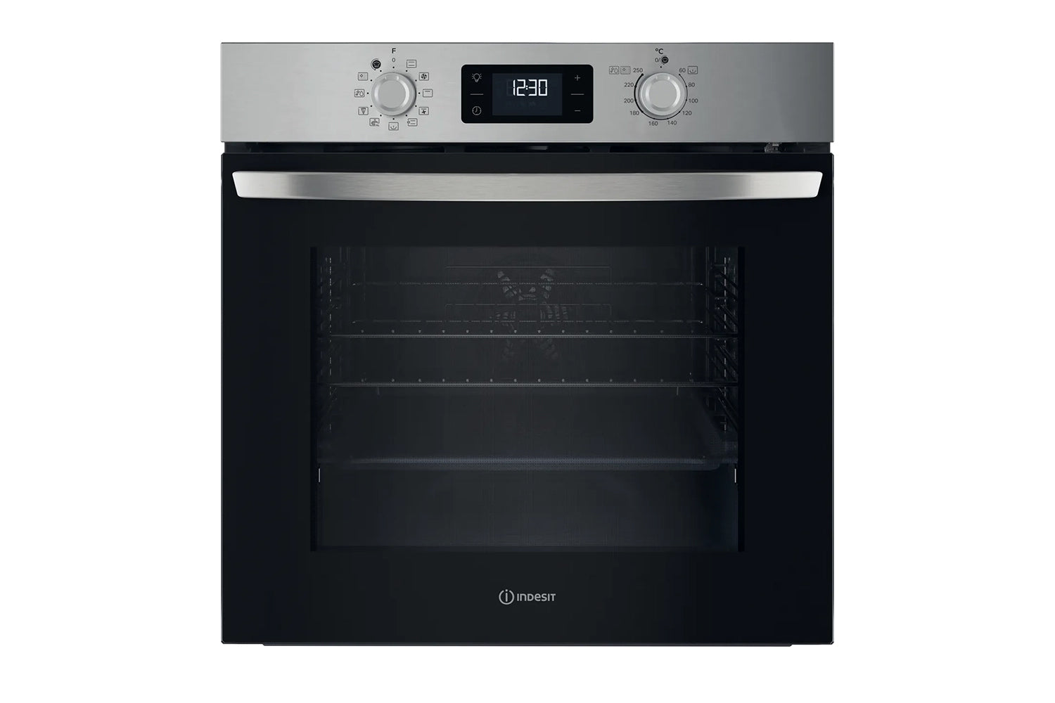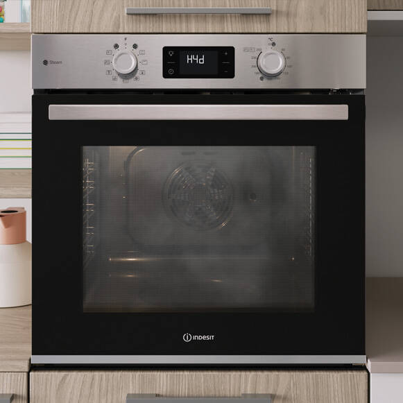 This Indesit Turn&Go fan oven features a stainless steel design that combines practicality with top performance, allowing anyone to achieve delicious cooking results the whole family will enjoy. Turn & go is an automatic cooking programme that simplifies everyday life. Just pop your food in the oven, turn the dial, and it will heat to 180°C, turning off after one hour without any need to preheat - it's that easy! Or you can choose from 8 pre-set cooking functions, giving you the flexibility to tackle any recipe. Designed for convenience, this 66L capacity oven features a Programmable Timer that lets you set the cooking time or delay the start so your meals will be ready when you are. And with a UK plug fitted, you just plug it in, and you're ready to go. Looking for a golden finish to your meal? Indesit Turbo Grill combines the intense heat of the grill with the even warmth of the fan to cook your meals faster and more evenly - perfect for achieving tender meat with a crispy skin. Cleaning your oven has also never been simpler. With DualClean, you can turn the dial and pick from two cleaning options - choose EcoClean to tackle everyday dirt using steam, or Pyrolytic for a deep clean at high temperatures. Plus, the handy Click & clean system lets you easily remove the inner glass of the door while the Tilting Grill unhooks and tilts, making cleaning those hard-to-reach spots a breeze so you can spend more time with your family. What's more, you can save money with this impressively efficient, A++ rated oven, which reduces energy consumption by 25%*.