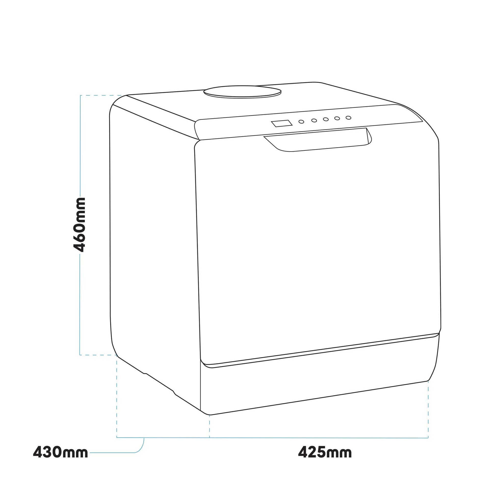 - Mobile Size - Perfect for caravans or small flats, this dishwasher's compact size means that space is no longer an issue. Fits standard 26cm plates. Product Dimensions (W x D x H): 425 x 430 x 460mm. Internal Dimension W x D x H: 350 x 340 x 320mm. Waste Pipe Length: 1540mm