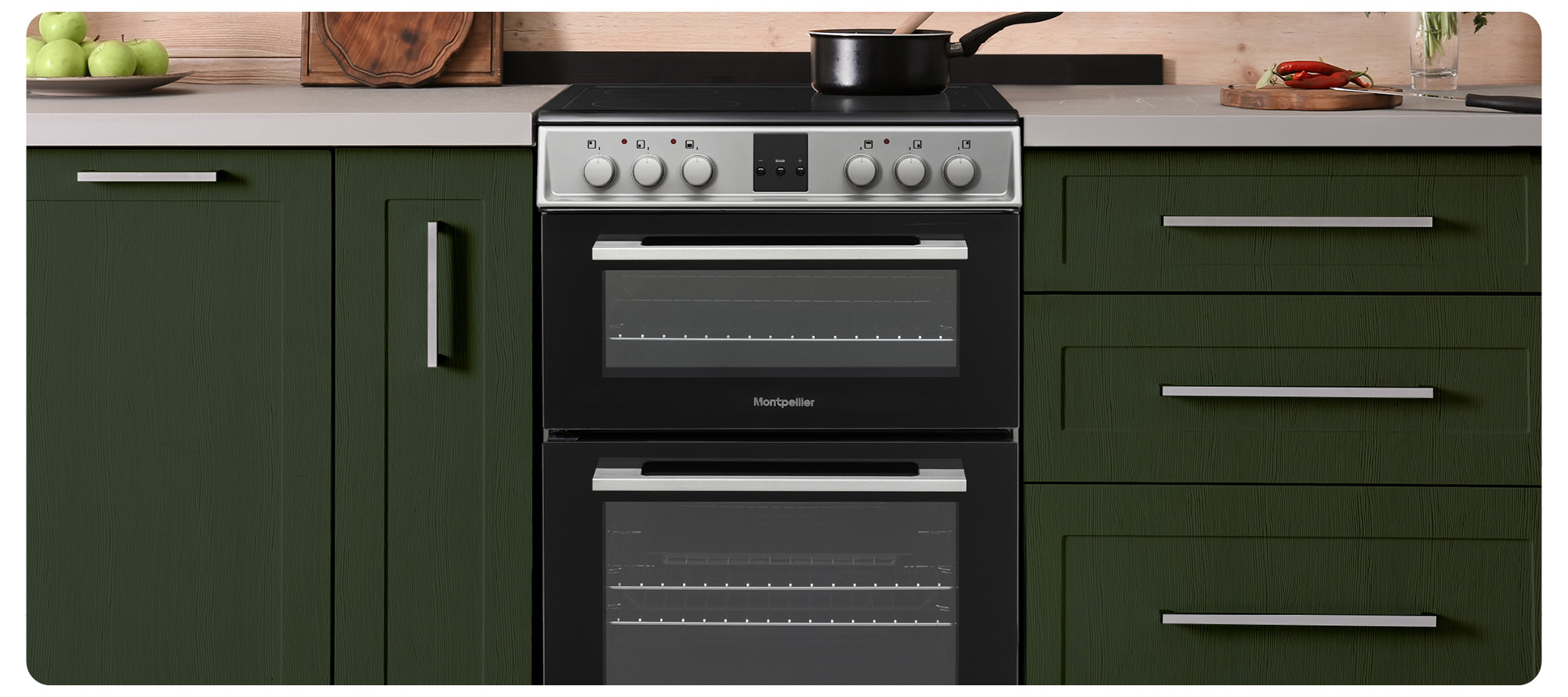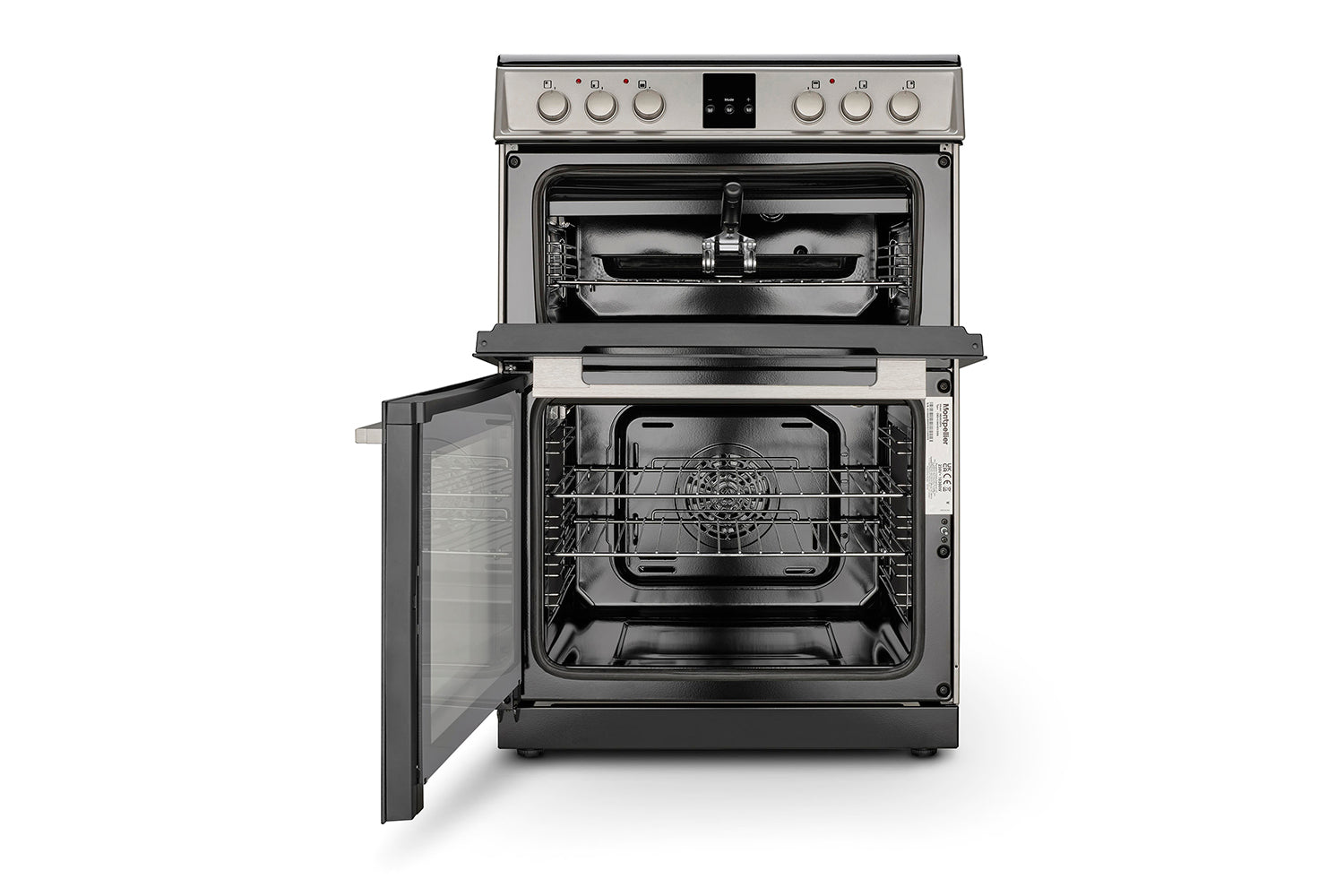 This all-new contemporary is a 60cm wide double ceramic cooker with four ceramic cooking zones, two ovens and a full width grill.