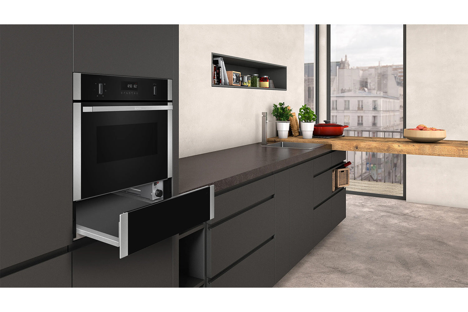 The warming drawer is a versatile tool: It keeps plates, utensils and cooked meals toasty warm while you prepare the rest. It can cook up to 80 degrees, so you can slow-cook duck until it’s tender, melting chocolate, or prove your dough. A gentle push is all you need to open – so you can easily place your dishes.