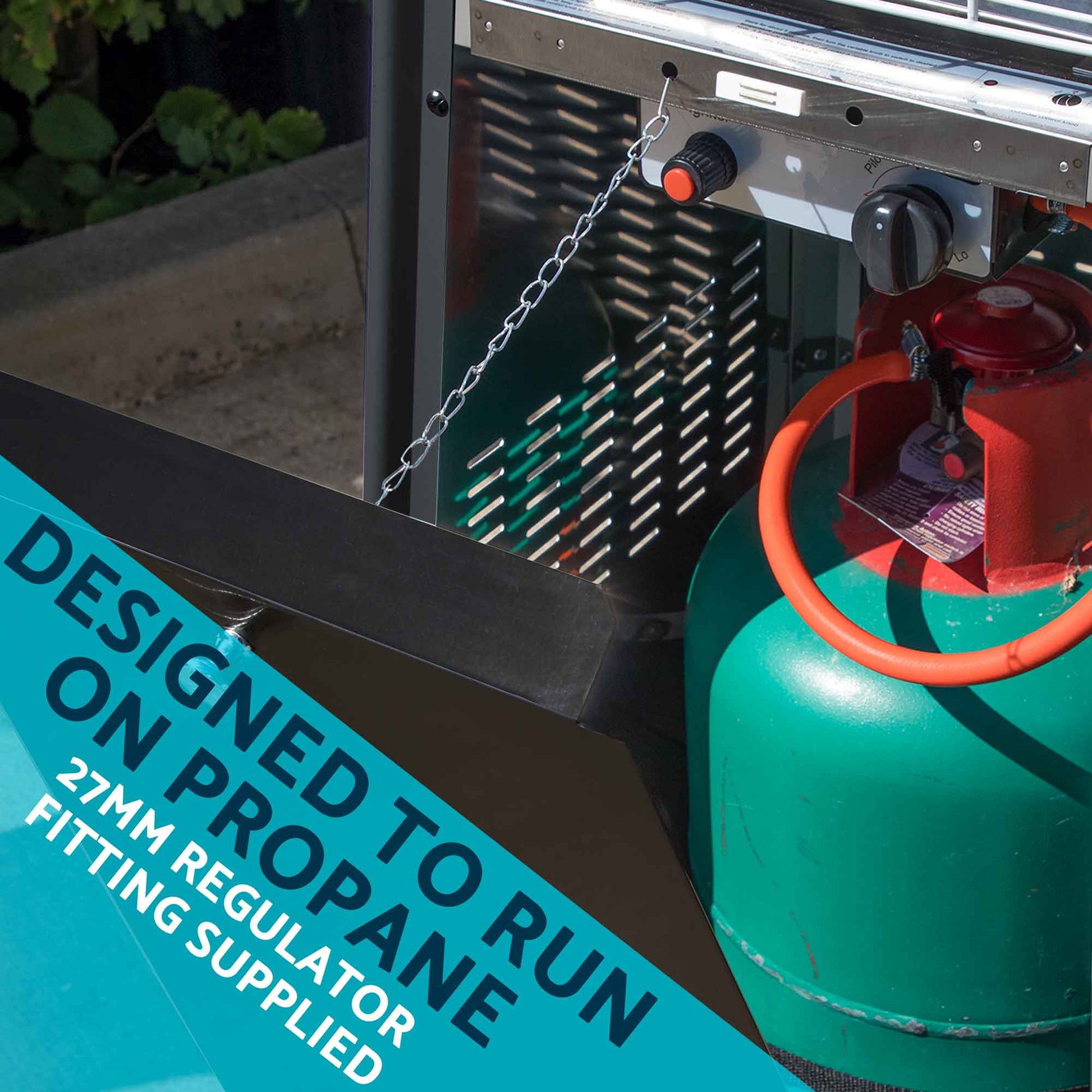 - Adjustable Heat - Variable temperature output controls and a fully enclosed propane gas cylinder chamber with safety tip over switch.