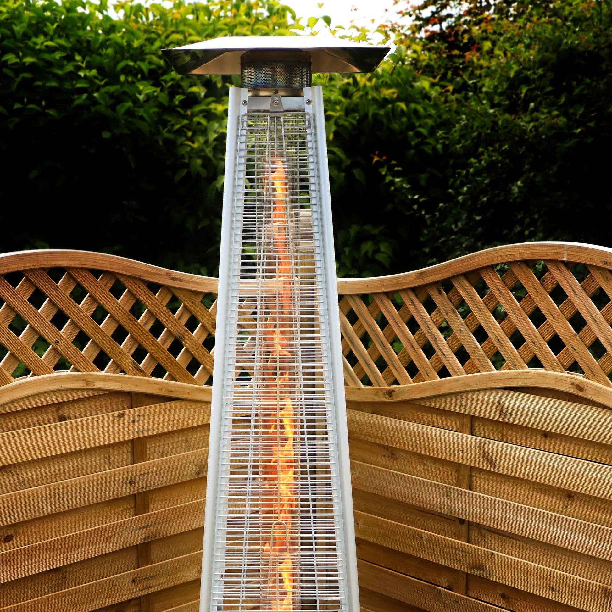 - Innovative Design - This gas flame pyramid stands at 2.27m tall, when lit the heater produces a real flame encompassed by a glass tube and heats the surrounding area. A metal reflector makes sure the heat is directed downwards and outwards.