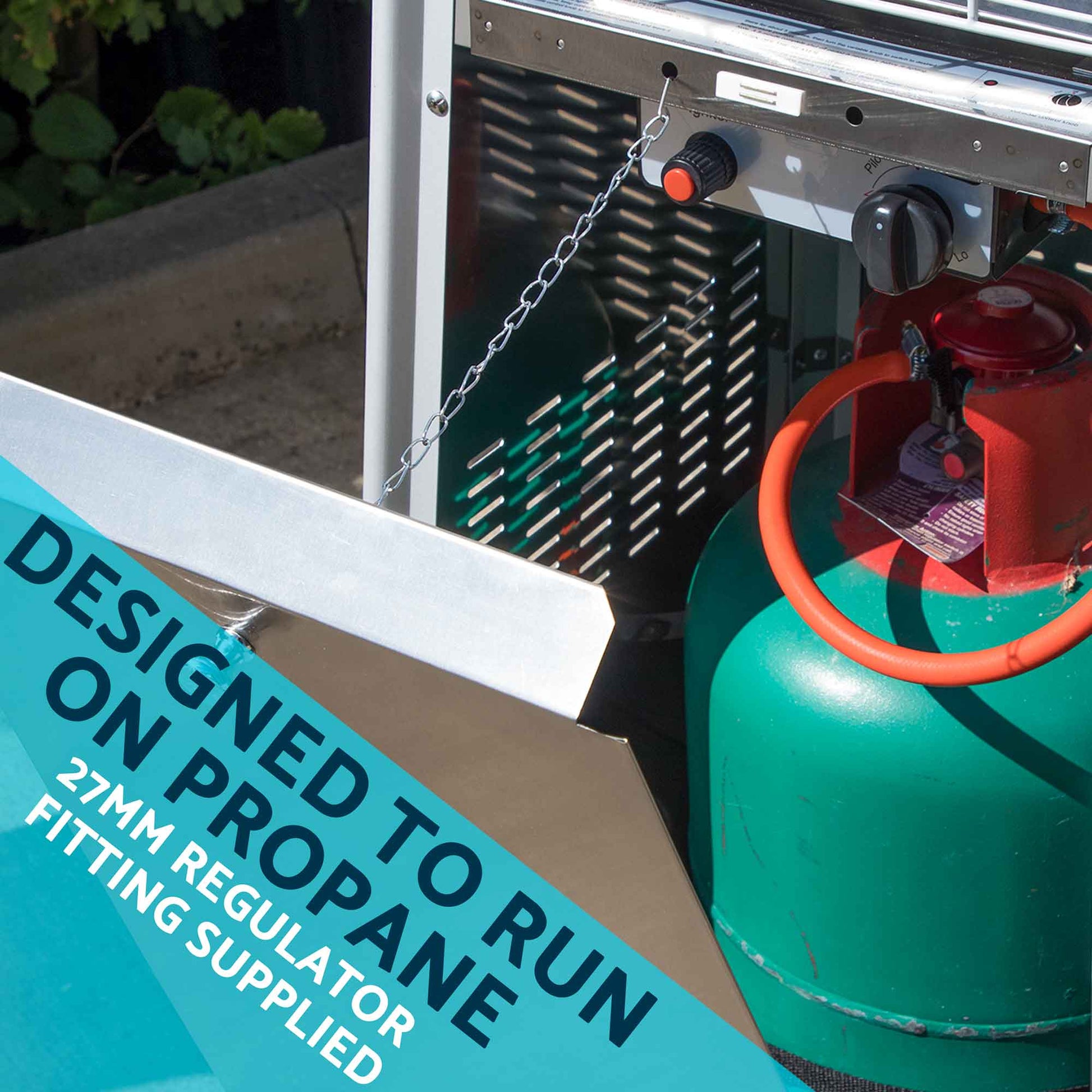 - Adjustable Heat - Variable temperature output controls and a fully enclosed propane gas cylinder chamber with safety tip over switch.