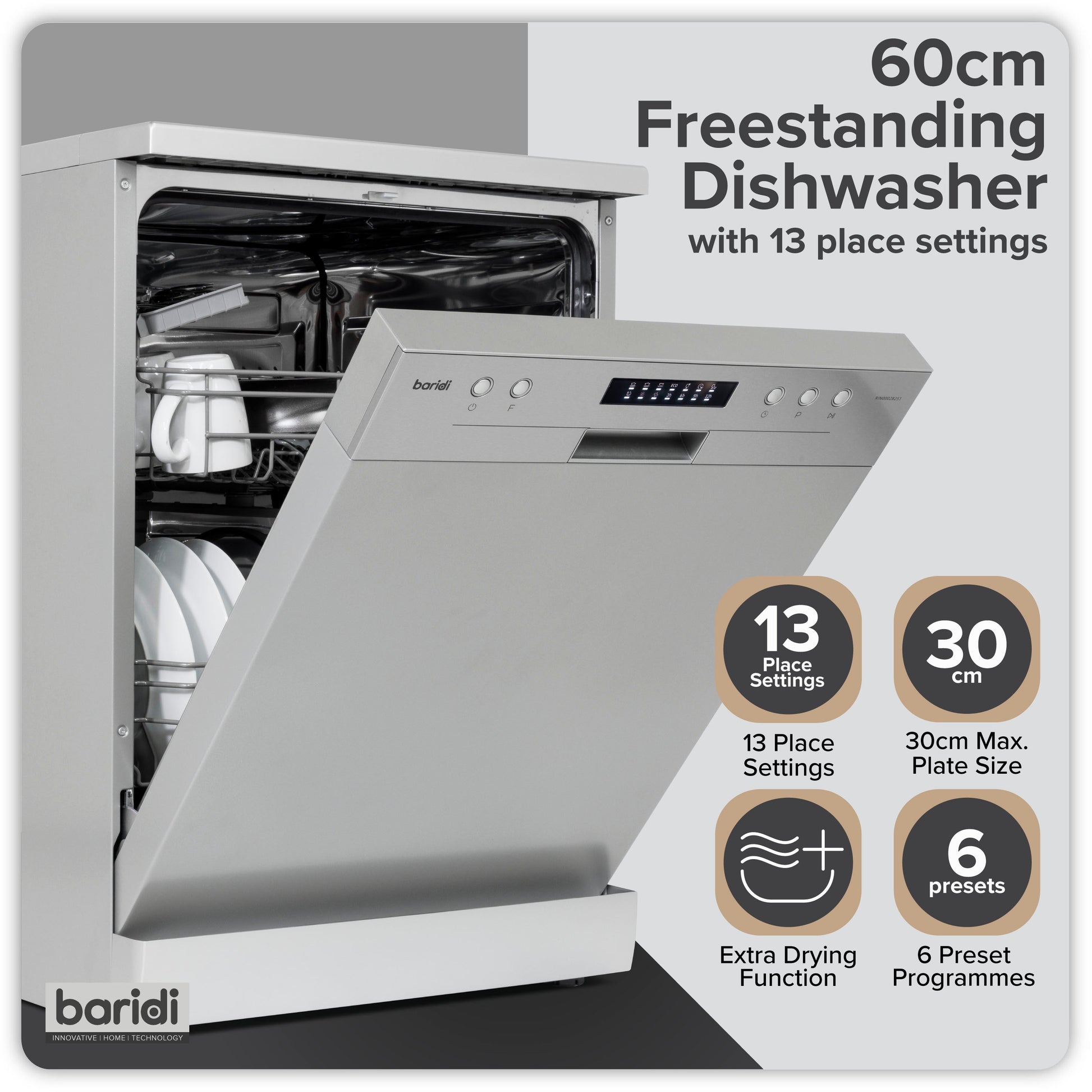 Baridi 60cm Freestanding Dishwasher, 13 Place Settings, 6 Programs, Silver - DH280
