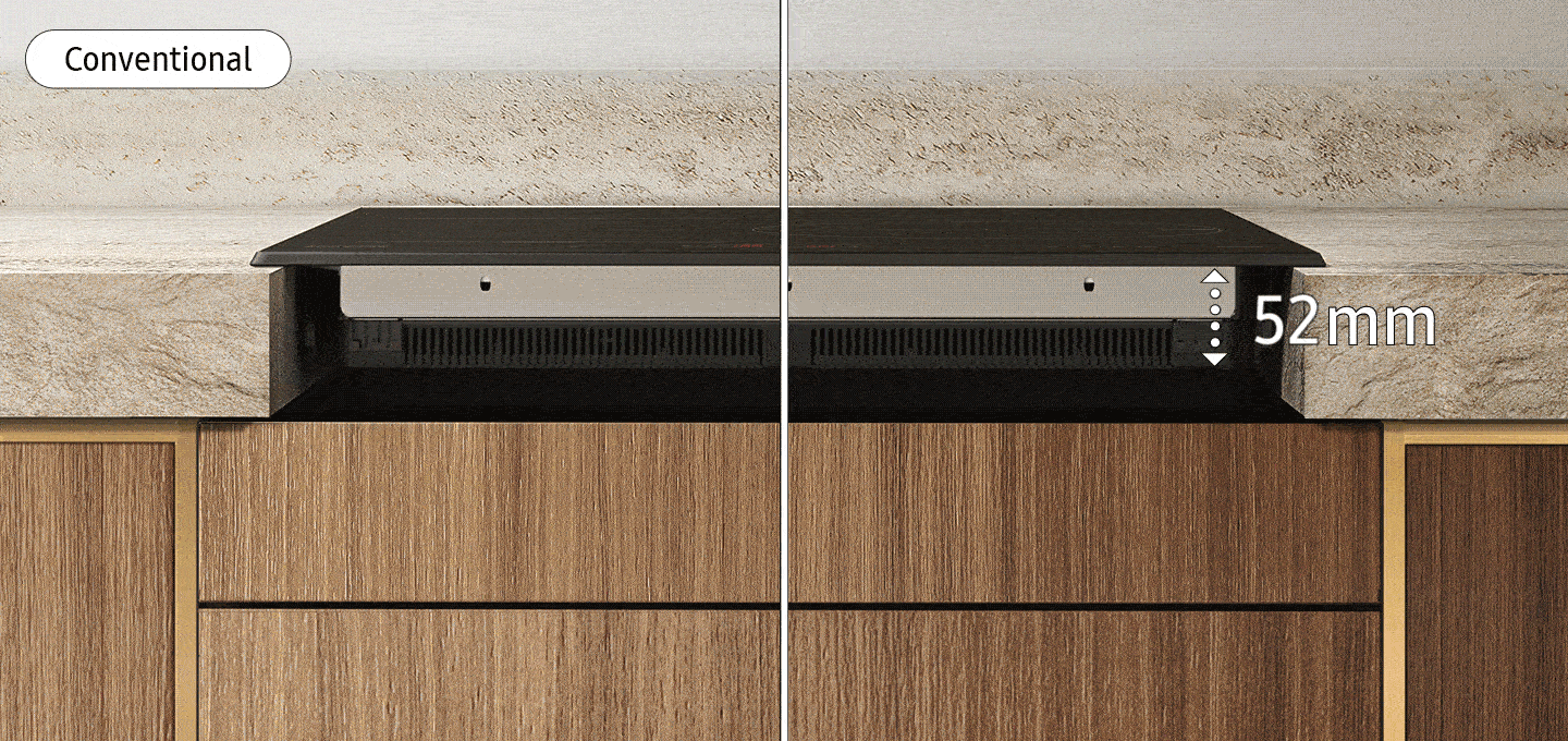 Add useful extra storage space to your kitchen*. The cooktop’s slim fit design fits harmoniously with a wide variety of worktops regardless of their thickness. It also means there is more space for a larger storage drawer. And it is easier to fit, reducing the time and cost of installation.
