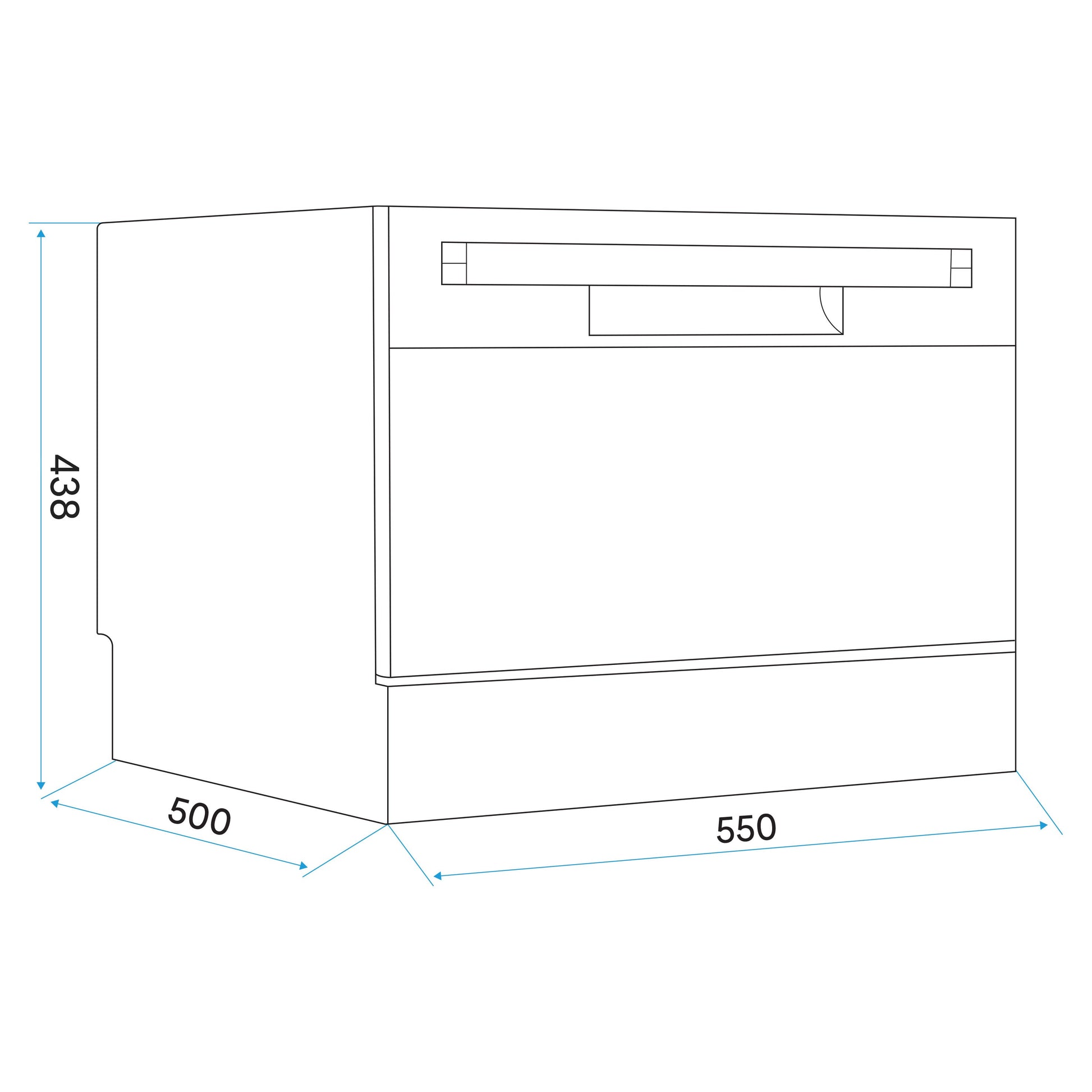 - Dimensions: (W x D x H): 550 x 500 x 438mm. Energy Class F. Uses less water than washing up at only 6.5L/cycle! The waste pipe can be plumbed in or just directed toward the plug drain. Waste Pipe Length: 1700mm