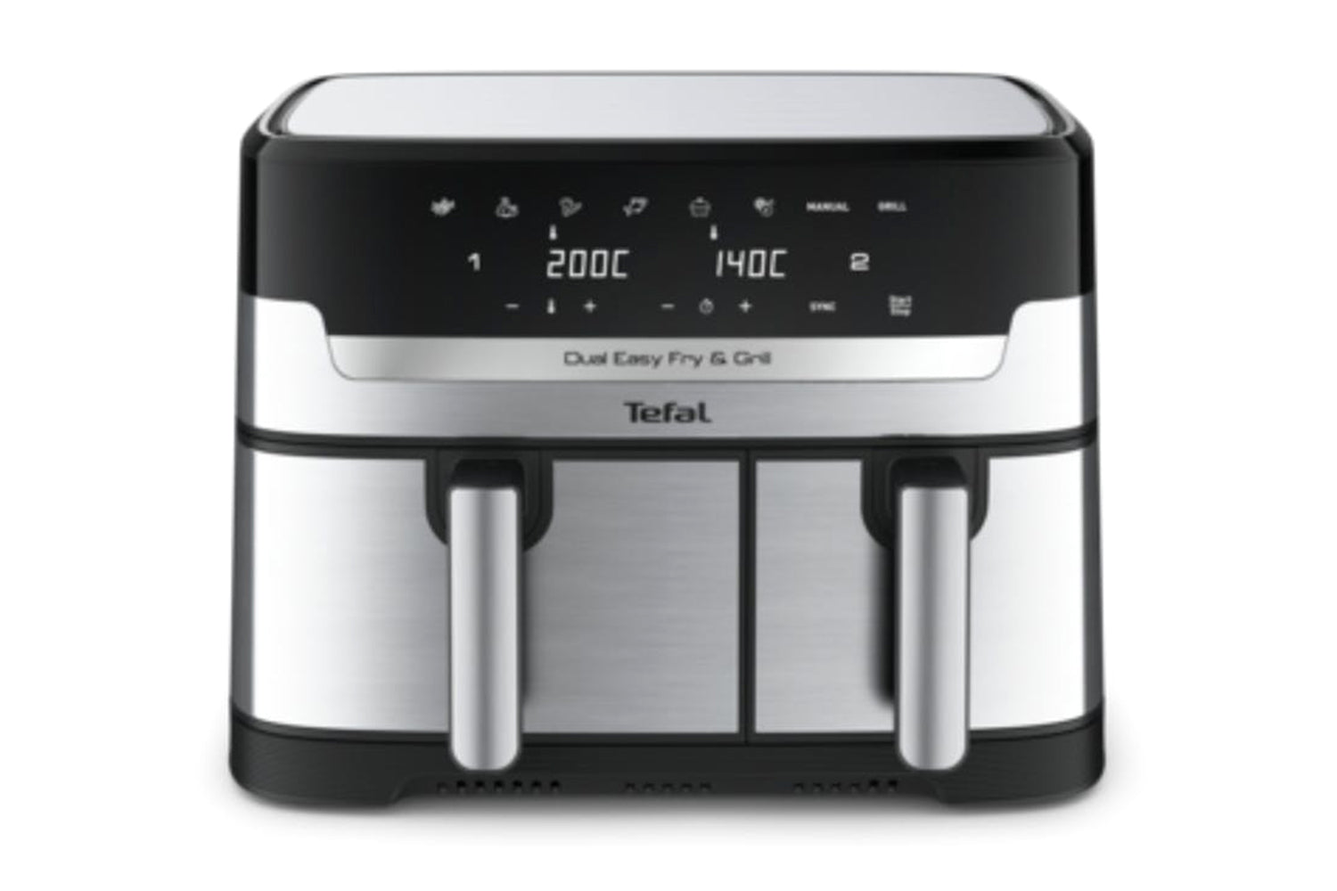 Double your cooking possibilities with Easy Fry Dual, Tefal’s premium stainless-steel dual air fryer and grill. Unlike other double air fryers, Easy Fry Dual has two different sized drawers – a 5.2L and a 3.1L – that work independently. It’s a single and dual air fryer in one. Solo meal? Just heat the small drawer to save energy. Or use both to cook a full meal – the XL drawer fits a whole chicken! The combined 8.3L capacity feeds up to 8 and you can SYNC the finish so everything’s ready at the same time. It’s 40% faster* than an oven, doesn’t need preheating, and uses up to 70% less energy**. So, you can get dinner on the table quicker whilst slashing your bills. 8 programs eliminate guesswork, so get creative. Air fry crispy dishes with 99% less added fat*** thanks to Extra Crisp technology. Grill steaks like a pro on the Sizzling Grill Plate. Roast meats, bake cakes, even dehydrate fruit snacks. There won’t be much washing-up either, the drawers and grill plate can go in the dishwasher.
